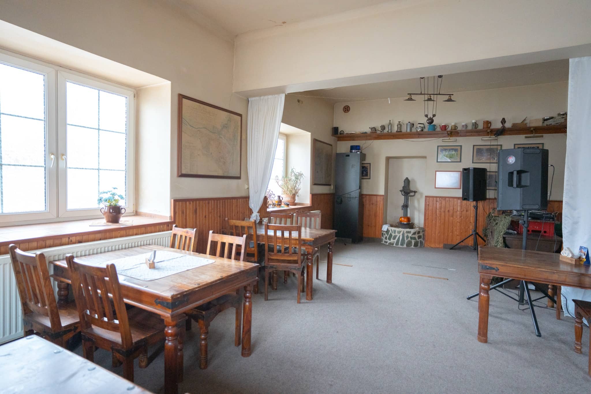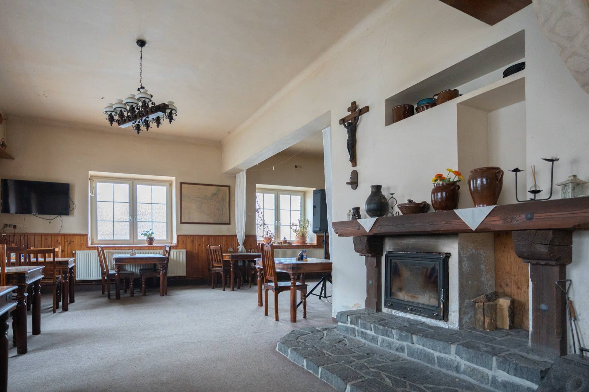Hostinec stále slouží svému původnímu účelu – je zde funkční restaurace s barem, velkou kuchyní a kompletním zázemím (sociální zařízení, šatny). Navíc se zde nachází dva nájemní byty – jeden 2+1 a 1+kk. Objekt je napojen na kanalizaci, vodovod a vytápění je zajištěno kombinací plynového kotle a horkovodního krbu, který je umístěn v části hostince. Celková užitná plocha činí 392 m², ale nevyužitá dvoupatrová půda nabízí možnost rozšíření až o dalších 260 m². Majitelka má pak k dispozici projekt - přestavba na bytové jednotky. Tato varianta otevírá cestu k realizaci například stylového penzionu, kombinace bydlení a podnikání, nebo bytového domu s historickým charakterem. Součástí ceny není vybavení restaurace.